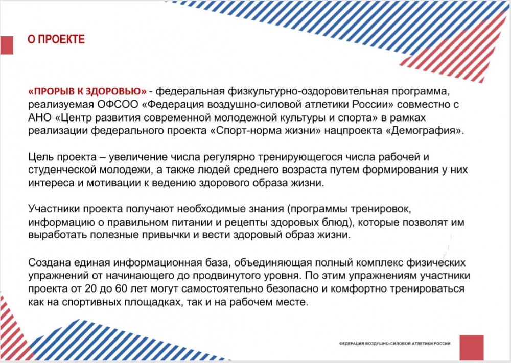 «Прорыв к здоровью» – это физкультурно-оздоровительный проект, направленный на общее оздоровление организма, популяризацию здорового образа жизни и повышение мотивации к регулярным тренировкам.