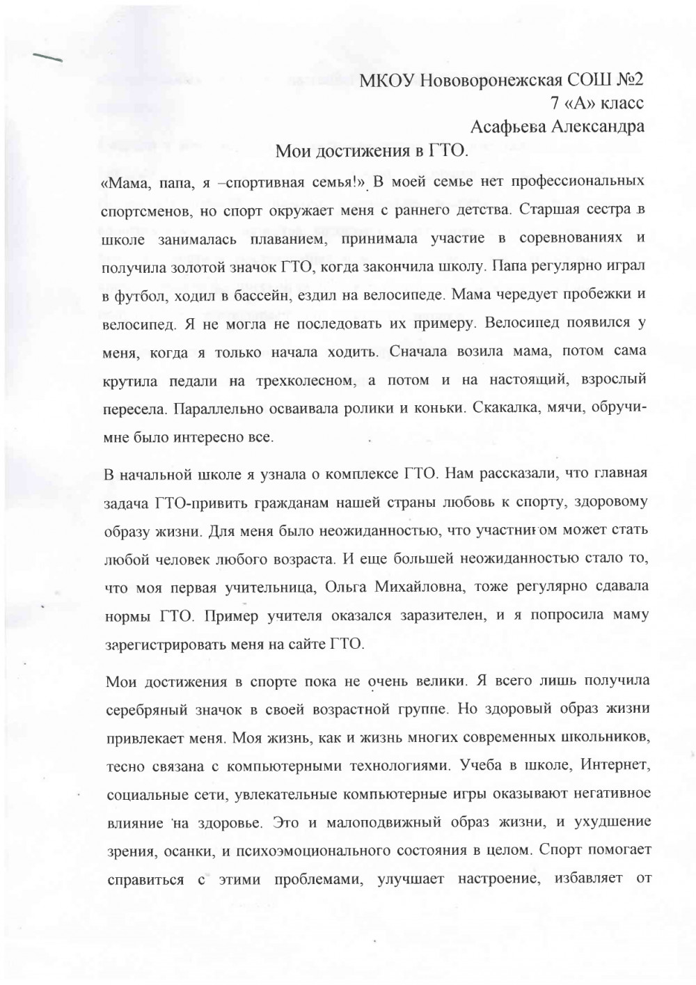 В течение года (с января по октябрь 2023 года) в нашем городском округе город Нововоронеж проходил конкурс, посвященный Всероссийскому физкультурно-спортивному комплексу «Готов к труду и обороне». Ученики школ города и дошкольники принимали участие и подготовили ряд творческих работ. В рамках данного ежегодного регионального творческого конкурса «ГТО в моей жизни» наши юные ребята продемонстрировали свои творческие способности и таланты. Асафьева Александра (ученица 7 «А» класса) из МКОУ Нововоронежская СОШ № 2 написала очень интересное сочинение о Всероссийском физкультурно-спортивном комплексе «Готов к труду и обороне».