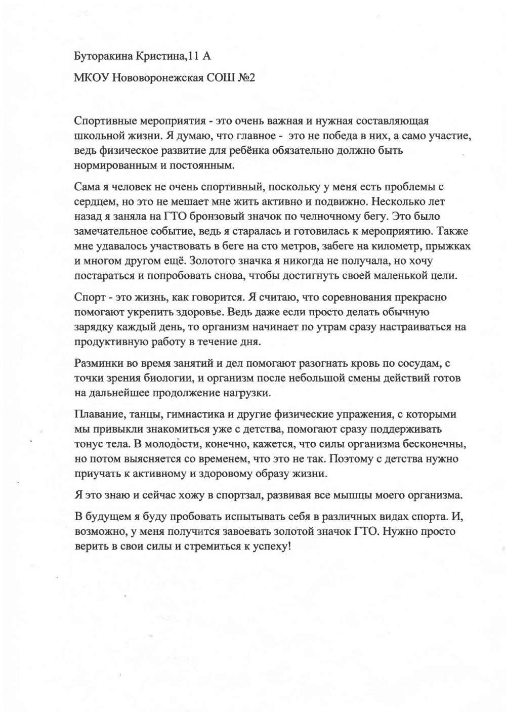 В течение года (с января по октябрь 2023 года) в нашем городском округе город Нововоронеж проходил конкурс, посвященный Всероссийскому физкультурно-спортивному комплексу «Готов к труду и обороне». Ученики школ города и дошкольники принимали участие и подготовили ряд творческих работ. В рамках данного ежегодного регионального творческого конкурса «ГТО в моей жизни» наши юные ребята продемонстрировали свои творческие способности и таланты. Буторакина Кристина (ученица 11 «А» класса) из МКОУ Нововоронежская СОШ № 2 написала очень интересное сочинение о Всероссийском физкультурно-спортивном комплексе «Готов к труду и обороне».