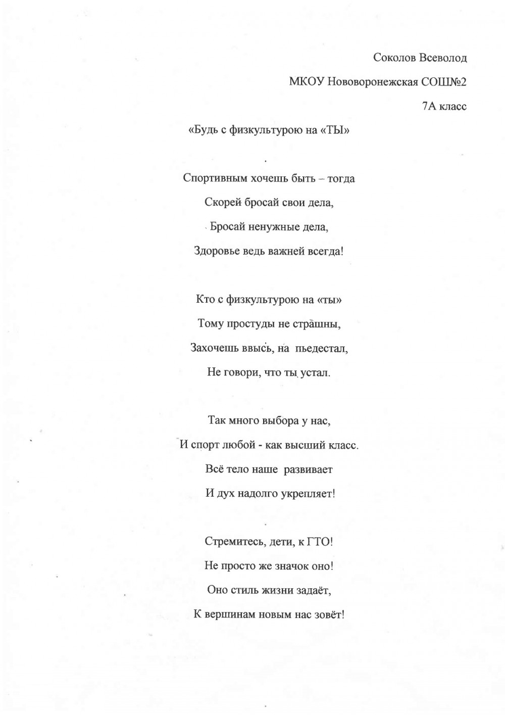 И по традиции в этом году ребята с новыми силами и творческими идеями принимают в данном конкурсе участие. Ученик МКОУ Нововоронежской СОШ № 2 Соколов Всеволод (7 «А» класс) принял активное участие. Он написал стихотворение на тему: «Будь с физкультурою на «ТЫ»» о Всероссийском физкультурно-спортивном комплексе «Готов к труду и обороне».