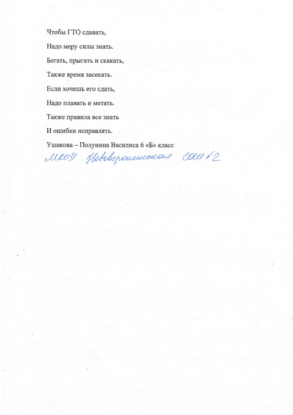 И по традиции в этом году ребята с новыми силами и творческими идеями принимают в данном конкурсе участие. Ученица МКОУ Нововоронежской СОШ № 2 Полунина Василиса (6 «Б» класс) приняла активное участие. Она написала стихотворение на тему: «Чтобы ГТО сдавать…» о Всероссийском физкультурно-спортивном комплексе «Готов к труду и обороне».