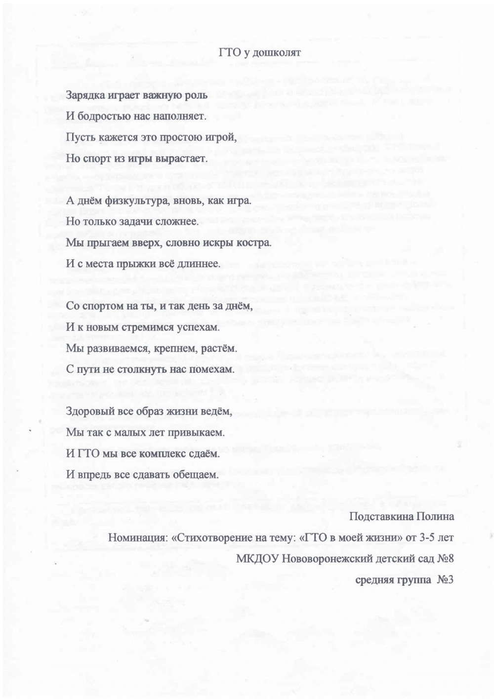 И по традиции в этом году ребята с новыми силами и творческими идеями принимают в данном конкурсе участие. Юная воспитанница МКДОУ Нововоронежского детского сада № 8 Подставкина Полина (4 года) приняла активное участие. Она написала стихотворение на тему: "ГТО у дошколят" о Всероссийском физкультурно-спортивном комплексе «Готов к труду и обороне».